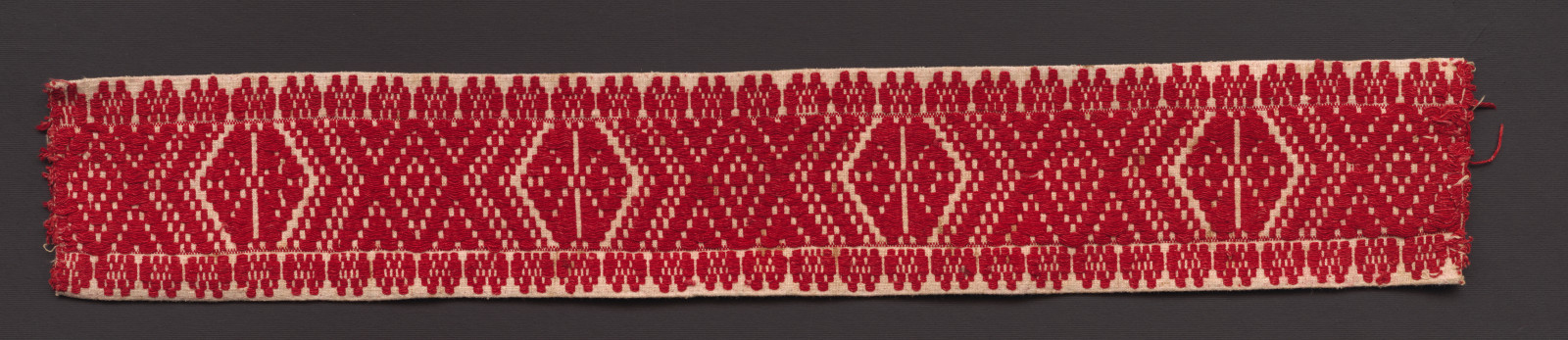 Tkaný pás s červeným preberaným vzorom. Pravdepodobne pochádza z rukávcov.