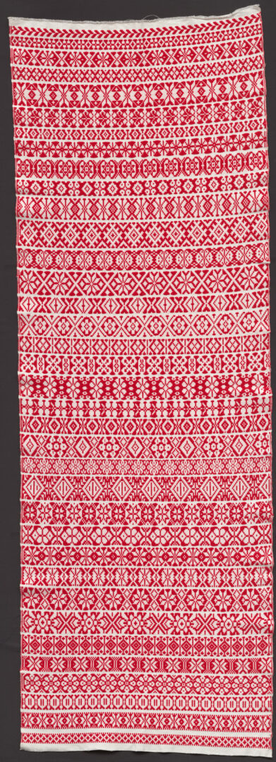 Vzorník tkaných vzorov z važeckých tkanín, červeno-biela farebnosť.