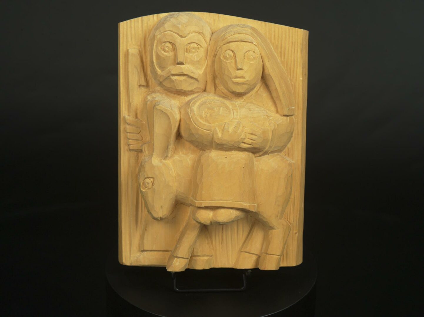 Útek do Egypta – rustikálna drevená reliéfna plastika znázorňujúca Jozefa a Máriu s Ježiškom v náručí. Farba prírodného dreva.