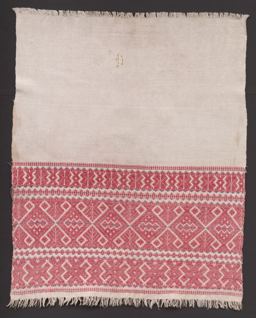 Ozdobný uterák utkaný z bavlnených nití. Základná väzba je plátnová, v spodnej časti je bohatý preberaný vzor červenej farby s geometrickými motívmi doplnený modrými zúbkami. Uterák je ukončený na oboch koncoch strapcami.