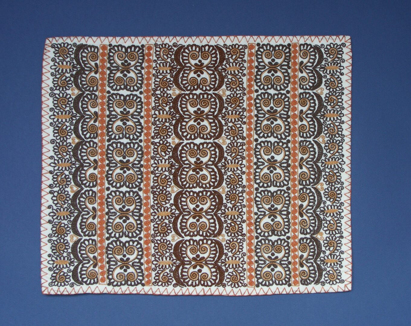 Vankúš je vyšívaný retiazkovým stehom krivou ihlou (háčik s ostrým zahnutím). Výšivka pochádza z okolia Detvy.
