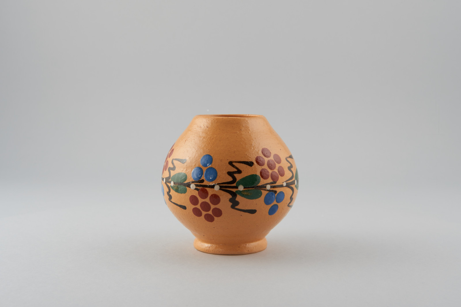 Váza keramická, točená na kruhu, baňaté bruško, úzke dno i hrdlo. Dekor: kvetinový pás. Farebnosť: modrá, zelená, hnedá, biela. Bezfarebná priehľadná glazúra.