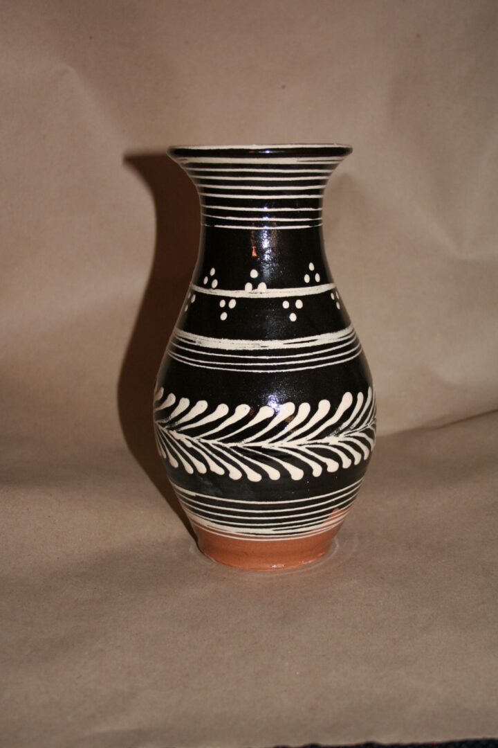 Ručne točená na hrnčiarskom kruhu, poliata tmavohnedou až čiernou hlinkou maľovaná pomocou kukučky (rožka) a štetcom bielou hlinkou geometrický a rastlinný dekor, transparentná bezfarebná glazúra.