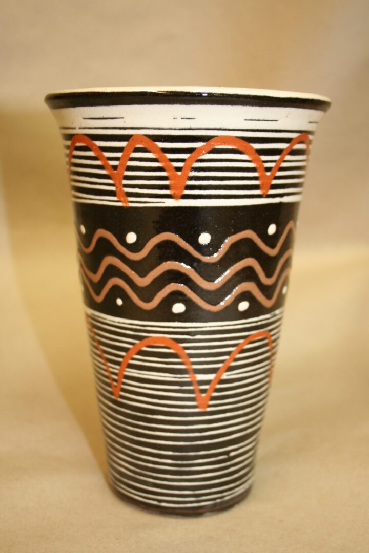 Ručne točená na hrnčiarskom kruhu, poliata tmavohnedou až čiernou hlinkou maľovaná pomocou kukučky (rožka) bielou hlinkou a farebnýmí hlinkami geometrický a rastlinný dekor, transparentná bezfarebná glazúra.