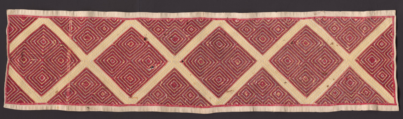 Výšivka na tenkom bavlnenom plátne. Použitý je výrez do tvaru kosoštvorcov a plný steh žltým, doma farbeným pamokom.