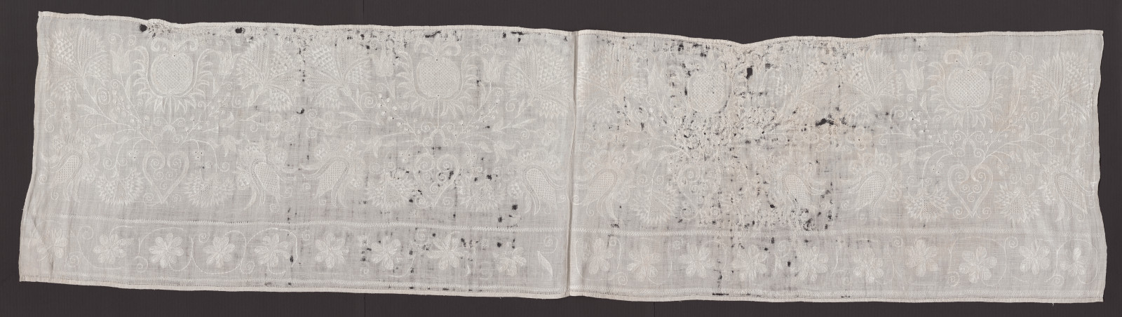 Časť z kútnej plachty – bavlnené plátno s bielou výšivkou v barokovom štýle. Motív je rastlinný – kvety vyrastajúce zo srdca.