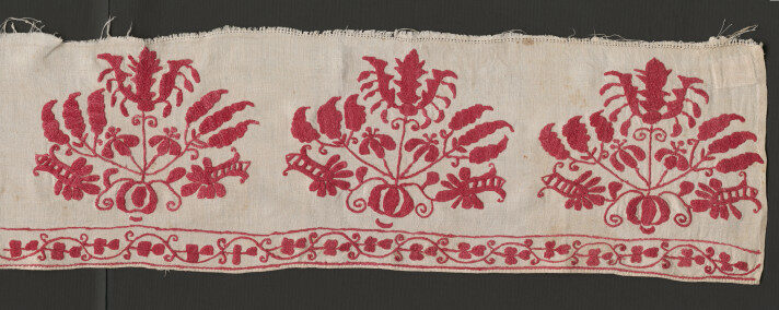 Výšivka z kútnej plachty. Ľanové plátno vyšité červenou niťou. Motív je rastlinný šitý plným plochým a stonkovým stehom.