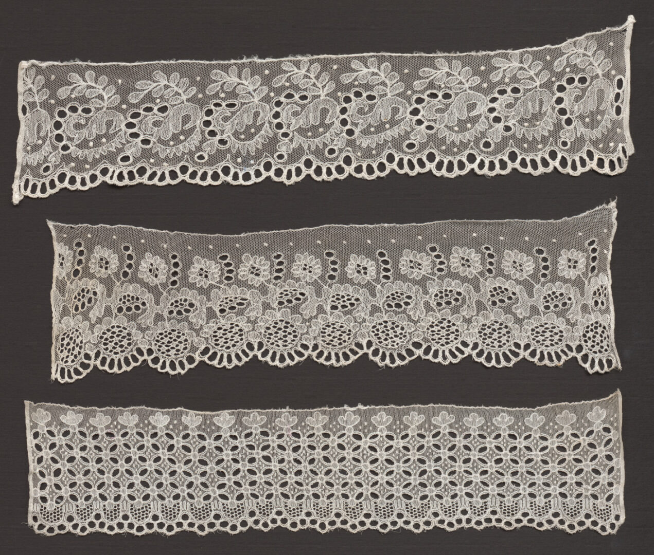 Výšivky na tyle používané na čepce. Materiál je jemný bavlnený tyl a biele nite na šitie a vyšívanie. Stehy plátací, na obnitku a slučkový. Motívy štylizované a rastlinné.