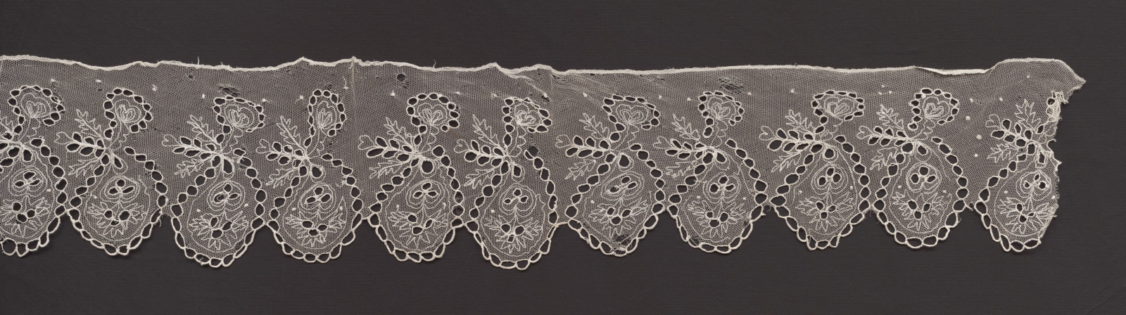 Biela kvetinová výšivka na bavlnenom tyle, výšivka na dierky a preťahovanie.