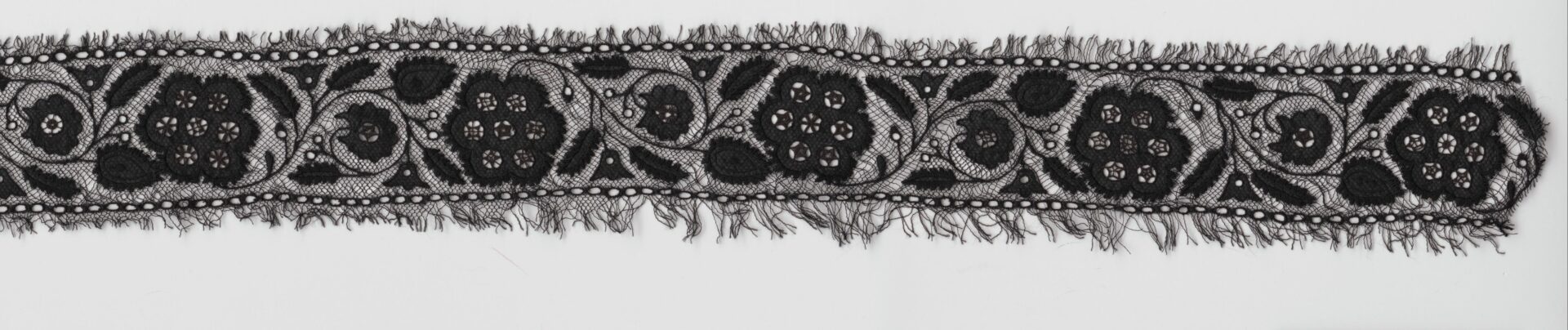 Výšivka na čiernom tyle s aplikovaným hodvábným atlasom. Štylizované rastlinné motívy trnavského charakteru. Materiál: čierny hodvábny tyl, čierny hodvábny atlas, čierne hodvábne nite Techniky: obnitka, plochý steh, dierky, gatre.