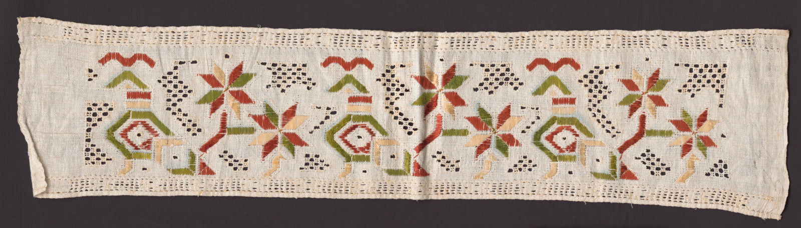 Základný materiál je biele ľanové plátno, výšivka je zhotovená z pestrých hodvábnych nití a ľanových nití. Vzor: kohút, techniky: hladkovanie, výrez, výšivka na vyťahovanej niti. Pochádza zo Spolku pre zveľaďovanie domáckej výroby.