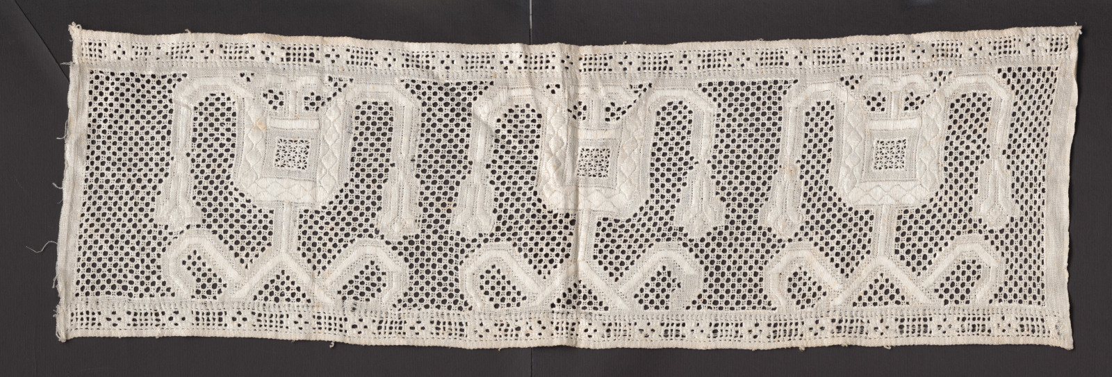 Ľanové plátno vyšité bielou ľanovou niťou. Renesančný motív, typický štylizovaný tulipán. Techniky: hladkovanie, žilinský výrez, gatre, formovanie, mešterka.
