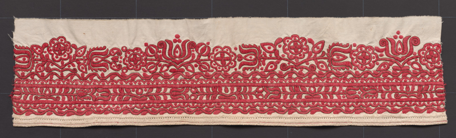 Výšivka je pravdepodobne z konca rukávov mužskej sviatočnej košele. Robená je na továrenskom plátne bavlnenou priadzou. Použitá je bavlna, ktorá slúžila na tkanie, konturovanie je robené jednou niťou tmavej farby, pôvodne bola čierna. Výšivka je predkreslená, motívy rastlinného ornamentu sú šité plným stehom, konturovanie je robené stonkovým.