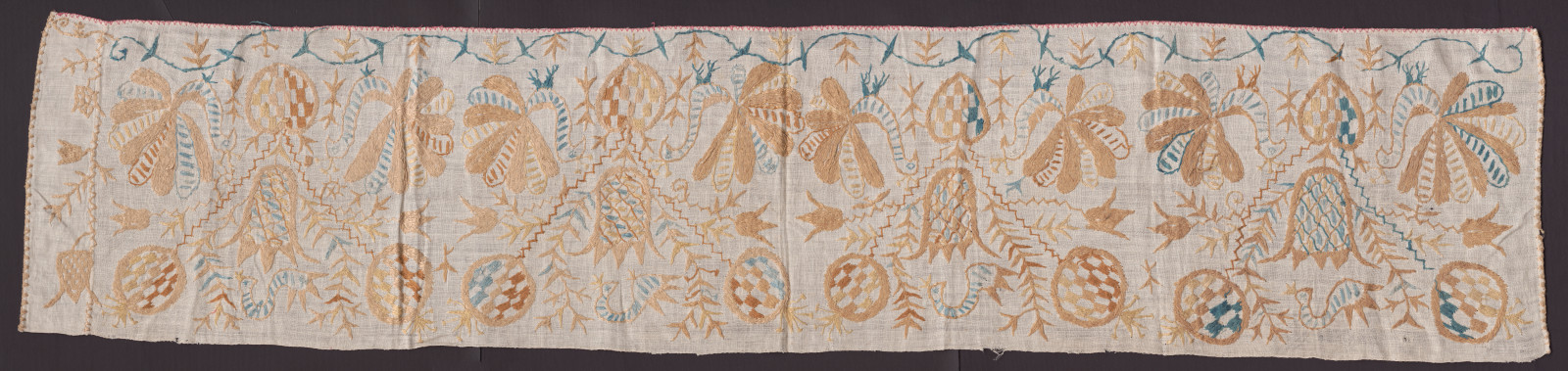 Vyšívaná vložka z plachty – tenké ľanové plátno vyšité podľa predkreslenia hodvábnymi niťami. Hlavný motív zobrazuje kvety vyrastajúce z granatového jablka s pávom po stranách. Motív sa na vložke opakuje 4 krát.