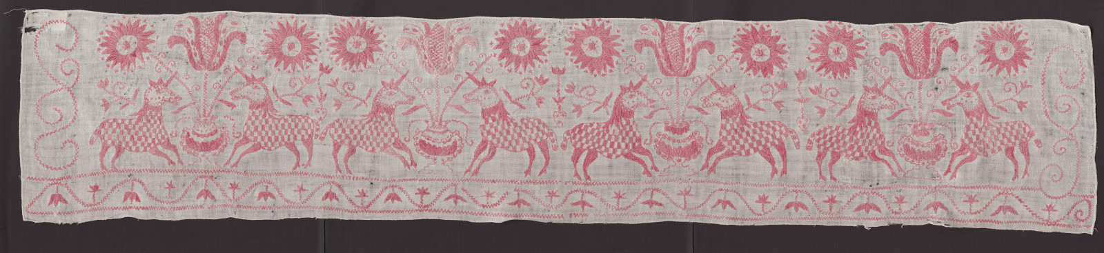 Časť z kútnej plachty. Ľanové plátno vyšité plochým stehom, stonkovým stehom a krokvičkou. Motív zobrazuje kvety vo váze a jednorožce.