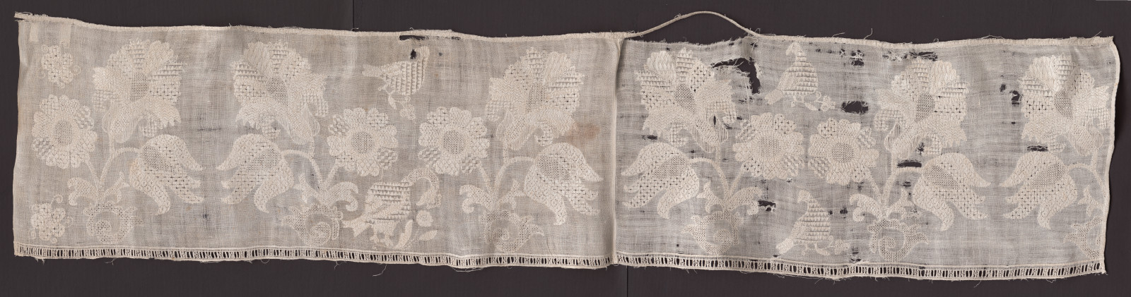 Výšivka z plachty – dve poly ľanového plátna zošité spolu vyšité bielou ľanovou niťou. Motív zobrazuje kvety a vtákov. Techniky výšivky sú plný steh, stonkový steh, kuracie ritky, na spodnom okraji je vyšitý pás hrachovinky.