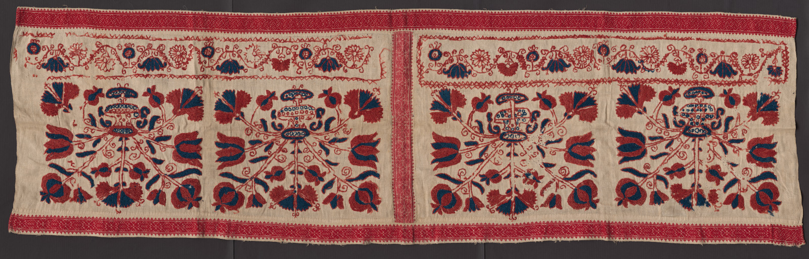 Výšivka z kútnej plachty – dve poly ľanového plátno v strede a na spodnom a vrchnom okraji s našitou továrenskou tkanicou. Výšivka je robená vlnou, niektoré časti sú vypadané. Motív znázorňuje kvety vo váze. Techniky: plný plochý a stonkový steh.