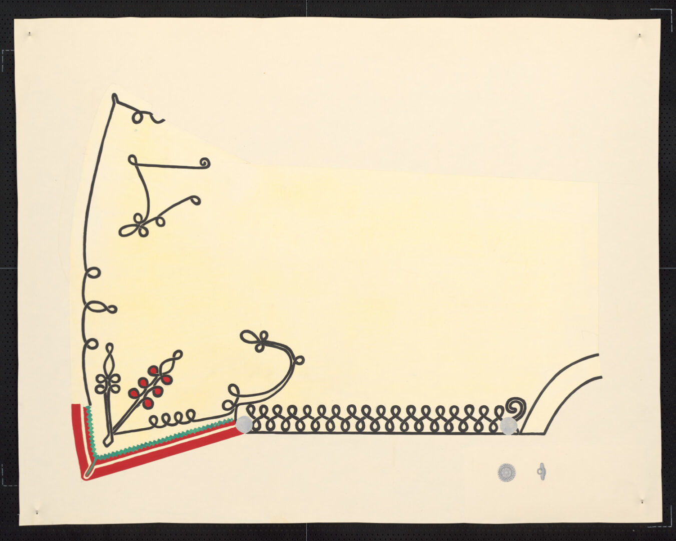 Ženská kabanica – kabaňa, začiatok 20. storočia. Zhotovená zo súkna prírodnej farby, ozdobená našívaním čiernej harasovej šnúry a lemovaním rohu. [kresba]