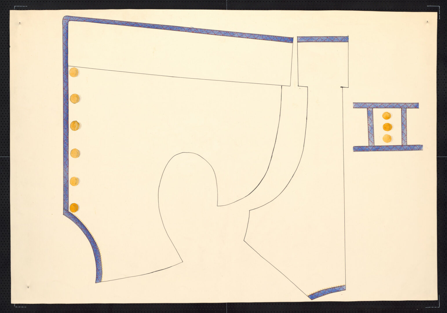 Ženský „kabát“ z čierneho súkienka, lemovaný modrou bavlnenou tkanicou. Tkanica je ozdobne preštepená červenou niťou. Kabátik sa zapína na hladké mosadzné gombíky. [kresba]