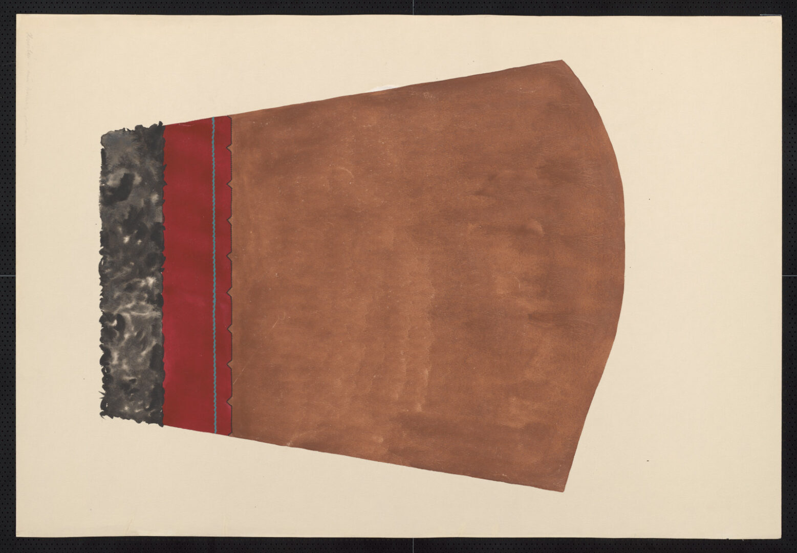 Mužský kožúšok „bruslík“. Hnedá ovčia kožušina, obramka z barančiny, lemovanie a sirmovanie irchou, červená, čierna a zelená farba. [kresba]
