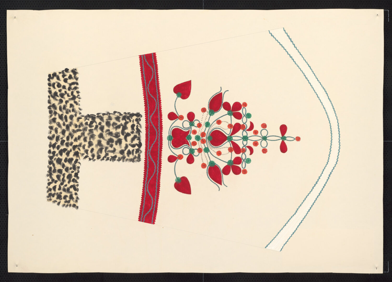 Biely ženský kožuch „kumen“, výzdoba rukáva. Na okraji je rukáv lemovaný čiernou kožušinou. Nad lemom je aplikovaný ornament pošitý hodvábnymi strapčekmi. [kresba]