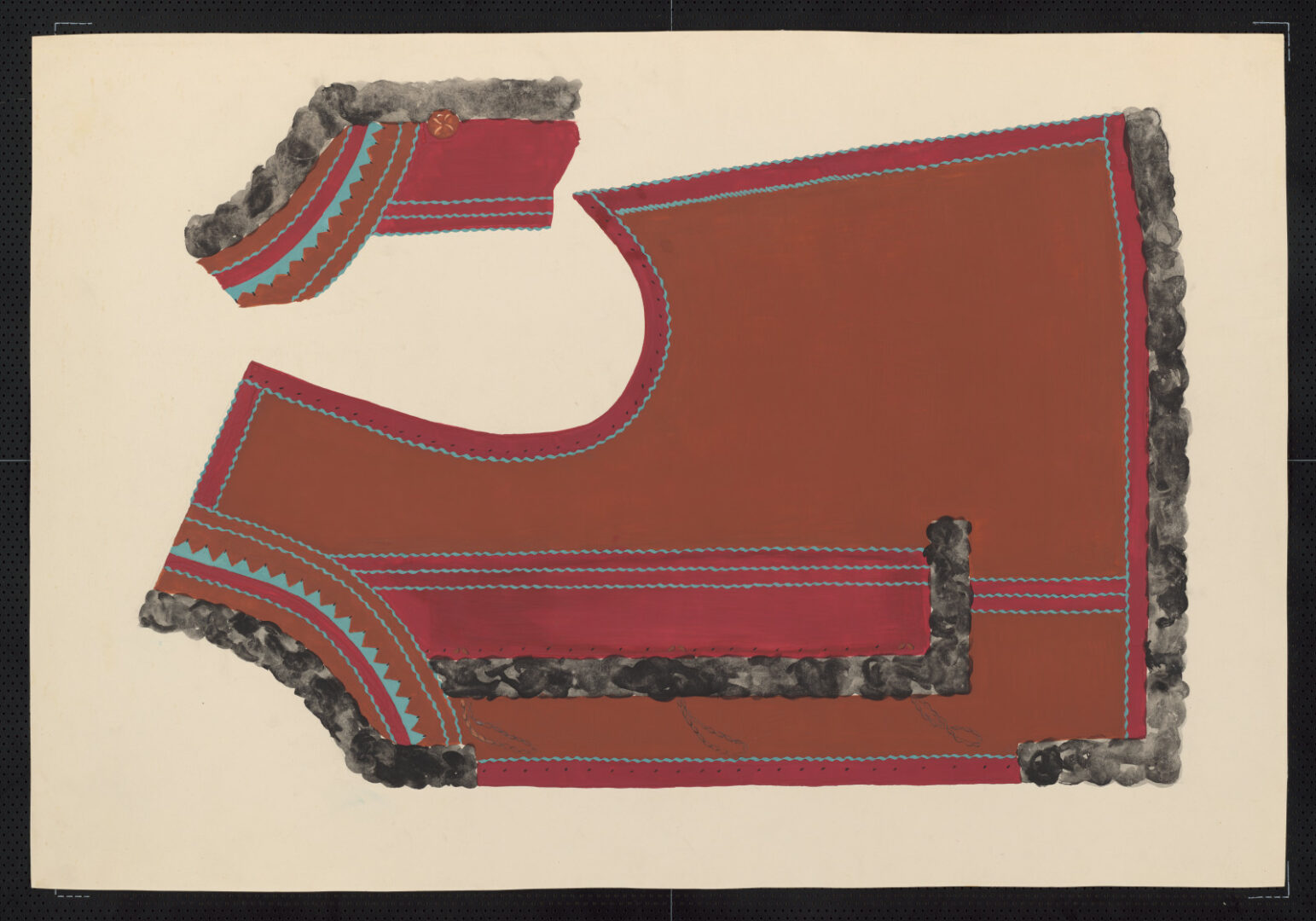 Mužský kožúšok „bruslík“. Hnedá ovčia kožušina, obramka z barančiny, lemovanie a sirmovanie irchou, červená, čierna a zelená farba. [kresba]