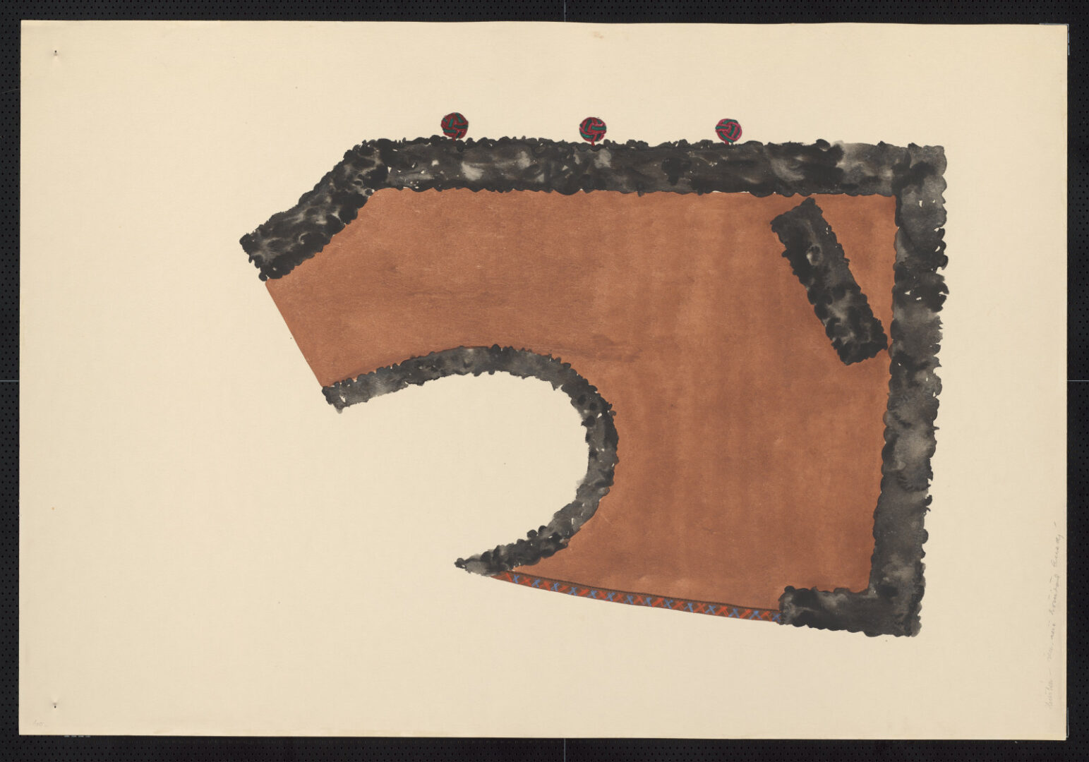 Ženský kožúšok, asi rok 1950. Základom je hnedá ovčina, lemovanie z barančiny, gombičky vypletané irchou. [kresba]