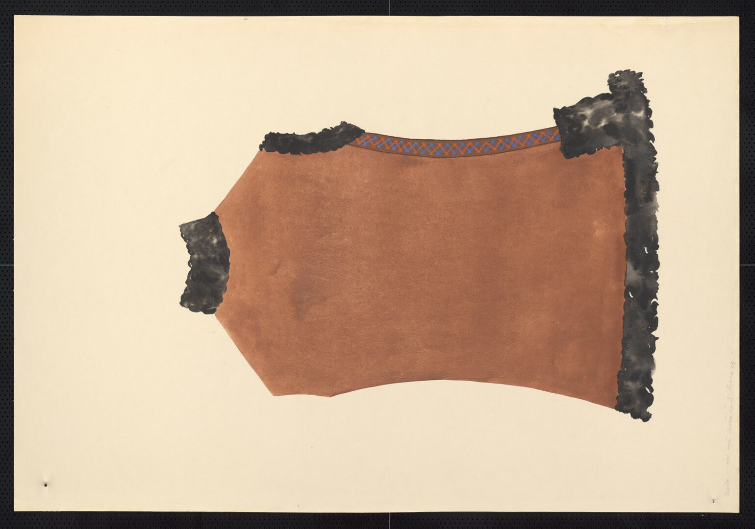 Ženský kožúšok, asi rok 1950. Základom je hnedá ovčina, lemovanie z barančiny, gombičky vypletané irchou. Výšivka na chrbte je šitá perlovkou. [kresba]