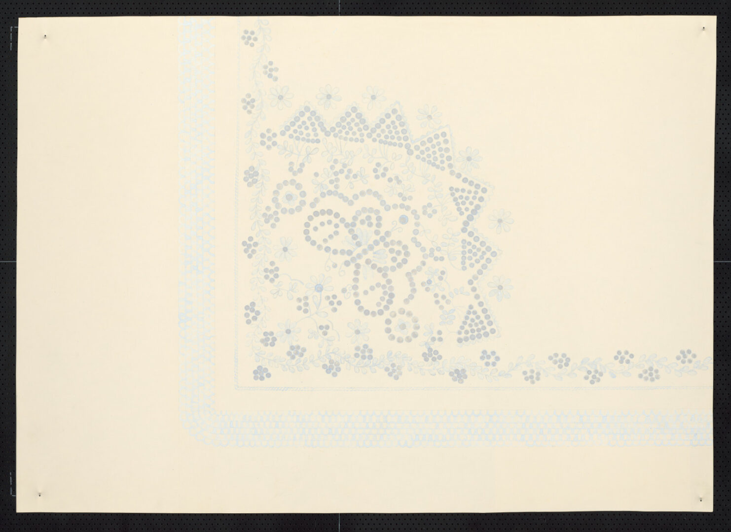 Sviatočná ženská šatka zo šifónu, vyšitá bielou bavlnkou. Dookola je prišitá hačkovaná čipka. Techniky – plný plochý steh, dierková výšivka, ažúrka. Rozmery zaznamenanej šatky 75 x 75 cm. [kresba]