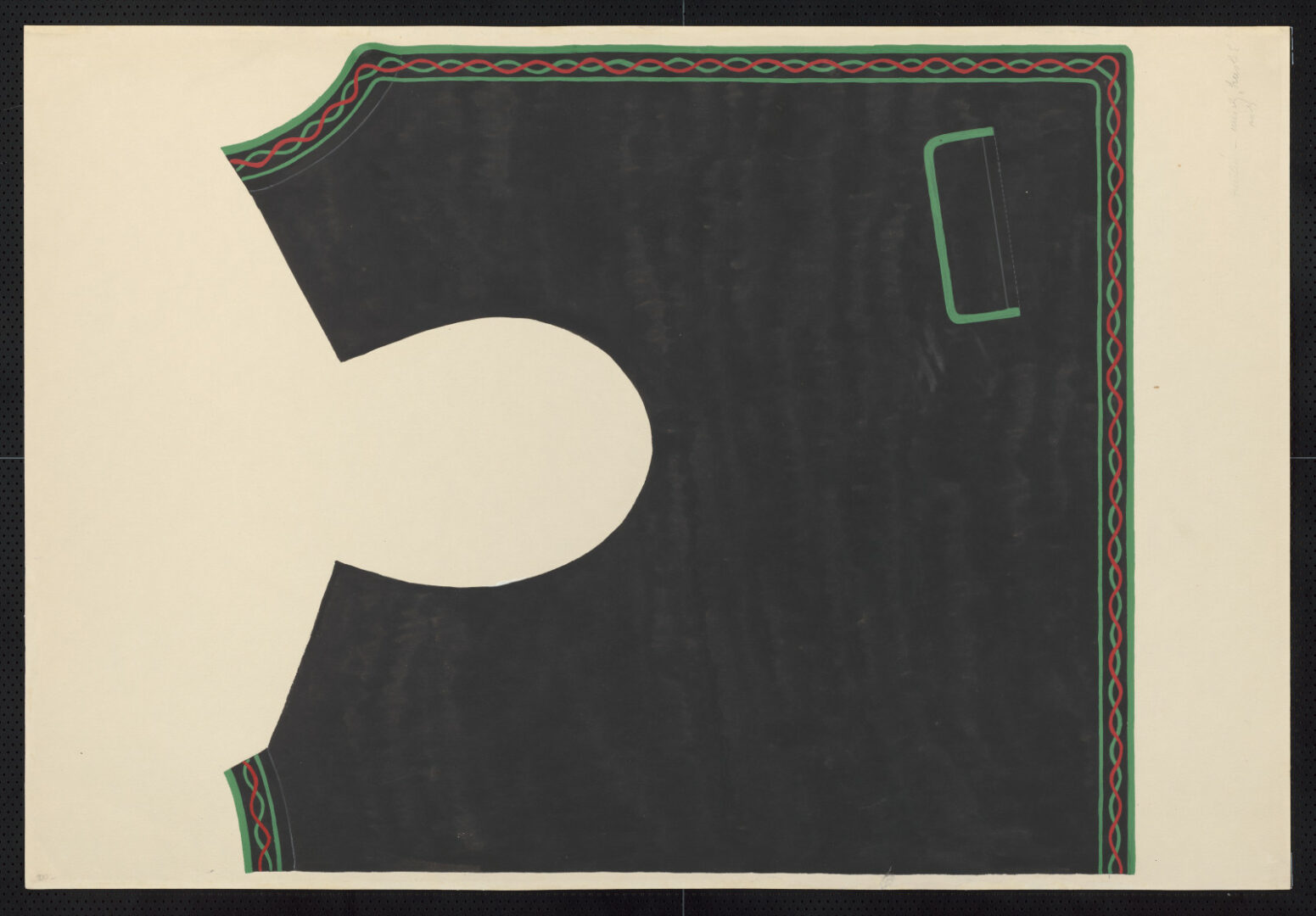 Mužský živôtik „bruslík“ z čierneho továrenského súkna. Lemovanie je urobené na obrátku zelenou haraskou. Šnúrovanie je z harasového šujtašu. [kresba]