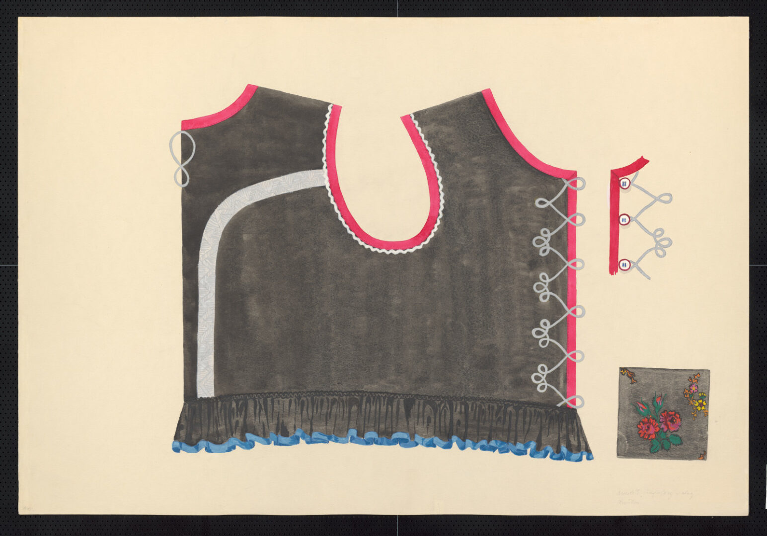 Ženský živôtik „bruslík“ starší. Základ tvorí čierny kvetovaný kašmír. Cukríkovo ružové lemovanie je z harasky, šnúrovanie zo strieborného šujtašu. Zúbky sú z bielej krepinky. Stuha na chrbte je strieborný šík. Živôtik bol zhotovený v roku 1907, bol sobášny. [kresba]