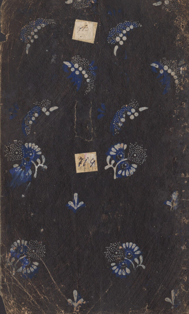 List vzorkovníka modrotlače: obojstranne potlačený kartón s bielym vzorom. 1. predná strana: plocha horizontálne rozdelená na dve polia – v hornom identické štylizované kvietky (stonka s dvomi kvetmi) s modrým dofarbením, diagonálne usporiadané, uprostrted hore nalepené číslo 711. V spodnej časti plochy dva druhy štylizovaných, čiastočne bodkovaných kvetov s modrým dofarbením, striedavo diagonálne usporiadané v ploche. Vpravo nalepené číslo 712. 2. zadná strana: plocha rozdelená horizontálne na dve polia – v hornom sú diagonálne usporiadané identické štylizované veľkoplošné „strapcovité kvety s modrým dofarbením, uprostred hore nalepené číslo 713. V spodnej časti veľkoplošné „dvojkvety“ s bodkovaním a modrým dofarbením symetricky rozložené v ploche. Uprostred nalepené číslo 714.