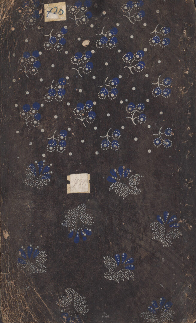List modrotlačového vzorkovníka: obojstranne potlačený kartón s bielym vzorom. 1. predná strana: uprostreed plochy veľký rozvilinový ornamentálny motív kvetov s lístkami a úponkami. Uprostred hore nalepené číslo 719. 2. zadná strana: Plocha horizontálne rozdelená na dve polia – v hornom symetrický motív štylizovaných identických bodkovaných „trojkvetov“ s modrým prifarbením, v diagonálne usporiedaných pásoch. Vľavo hore nalepené číslo 720. V spodnom poli identické štylizované kvety s bodkovanými lístkami a modrým prifarbením v diagonálnom usporiadaní. Uprostred nalepené číslo 721.