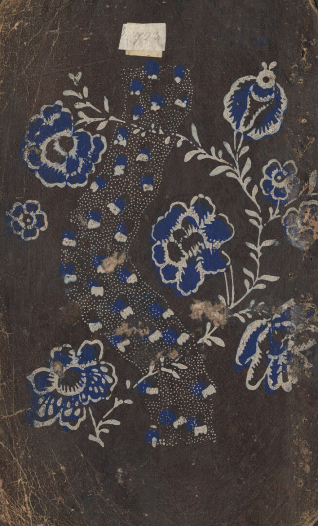 List modrotlačového vzorkovníka: obojstranne potlačený kartón s bielym vzorom. 1. predná strana: v strede plochy pravidelný vzor s identickými štylizovanými kvetmi, predstavujúcimi ratolesť s bodkovanou bobuľou s modrým prifarbením. Usporiadané sú v horizontálnych pásoch. V strede hore nalepené číslo 722. 2. zadná strana: veľkoplošný kvetinový motív s modrým podfarbením, uprostred so zvlneným širokým sieťovým bodkovaným pásom. Uprostred hore nalepené číslo 723.