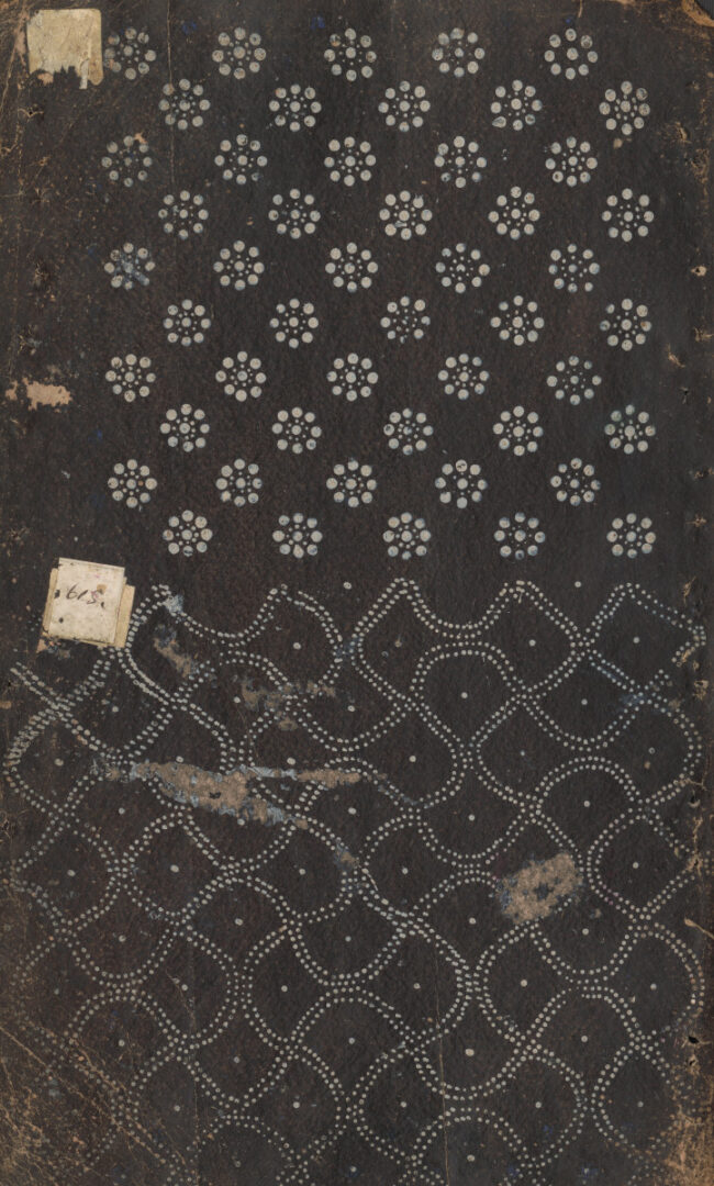 List modrotlačového vzorkovníka: obojstranne potlačený kartón s bielym vzorom. 1. predná strana: plocha horizontálne rozdelená na dve polia – v hornom symetrický diagonálne orientovaný geometrický motív so štylizovanými kvetmi, obkolesenými bodkovanými krúžkovými rámikmi. Vpravo hore nalepené číslo 612.V spodnom poli symetricky orientovaný geometrický vzor zložený z bodkovaných krúžkov s bodkou uprostred, striedajúcich sa so štvorbodkami. Vpravo nalepené číslo 613. 2. zadná strana: Plocha horizontálne delená na dve polia – v hornom symetrický motív bodkovaného kvetu v diagonálne orientovaných pásoch. Vľavo hore nalepené nečitateľné číslo. V spodnom poli diagonálne orientovaný zvlnený sieťový motív s dvojradovou bodkovanou kontúrou, v strede každého políčka s bodkou. Vľavo nalepené číslo 615.