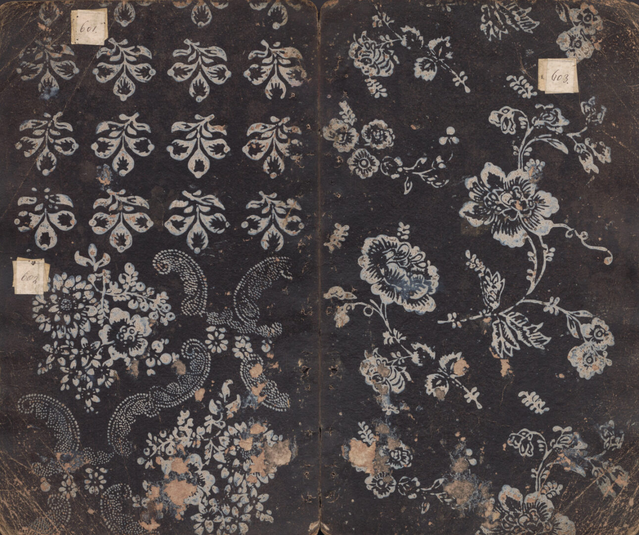 Vzorkovník modrotlače – dvojhárkový kartón s otlačeným bielym vzorom: 1. strana: veľkoplošný rozvilinový ornamentálny motív so dvomi identickými štylizovanými naturalistickými kvetinovými motívmimi s lístkami a úponkami.Vpravo hore nalepené číslo 600. 2.strana: Plocha horizontálne rozdelená na dve polia – v hornom v horizontálnych pásoch identické rastlinné motíby vetvičiek s listami. Hore nalepené číslo 601. V dolnom poli dva identické kvetinové motívy s vybodkovanými listami. Uprostred vľavo nalepené číslo 602. 3. strana: Veľkoplôošné kvetinové motívy rôznych kvetov s rozovlátymi úponkami a lístkami. Vpravo hore nalepené číslo 603. 4. strana: celú plochu zaberá bizarný barokizujúci ornamentálny motív s volútami a kvetmi so stonkami. Uprostred hore nalepené číslo 604.