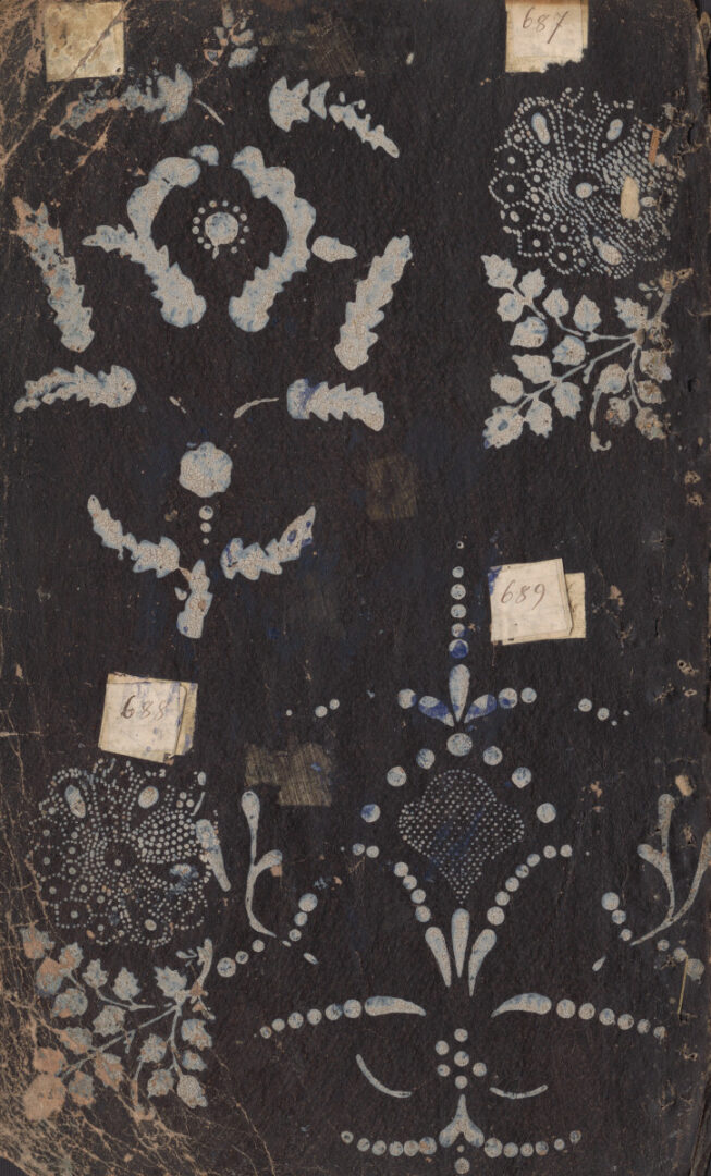 List vzorkovníka: obojstranne potlačený kartón s bielym vzorom 1. predná strana: v ploche hore uprostred v jenných kontúrach samostatný rastlinný motív so siedmimi kvetmi, vo vrchole nalepené číslo 371. Pod ním dole vedľa seba dva takmer identické kvetinové motívy v silných kontúrach.nad ľavým nalepené číslo 372, nad pravým nalepené číslo 373. 2. zadná strana: v celej ploche rozmiestnené štyri rôzne veľkoplošné kvetinové motívy, označené nalepenými číslami: vľavo hore …(?), vpravo hore 687, uprostred vľavo 688, uprostred vpravo 689.