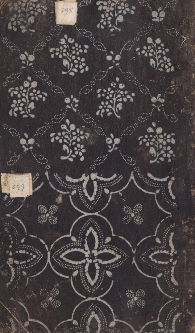 List vzorkovníka modrotlače: obojstranne potlačený kartón s bielymi vzormi. 1. predná strana: Plocha horizontálne rozdelená na dve polia: v hornom veľkoplošný ornamentálny motív dvoch párov identických veľkoplošných kvetov v diagonálnom usporiadaní proti sebe. Uprostred rakúsky štátny znak – orol vo vrchole s krížom na trojvrší, po bokoch delené koleso a svastika. Vpravo hore nalepené číslo 596. V spodnom poli plocha vyplnená identickými kvetinovými motívmi v diagonálnom usporiadaní striedavo väčšie s menšími, priestor medzi nimi vyplnený bodkovanými úponkami. Vpravo nalepené číslo 597. 2. zadná strana: Plocha horizontálne rozdelená na dve polia: v hornom celoplošný „sieťový“ ornamentálny motív identických kvetov v diagonálnom usporiadaní v kosoštvorcových plochách vymedzený bodkovanými lístkami. Hore nalepené číslo 598. V spodnom poli sieť veľkoplošných „štvorlístkov“ vymedzených kontúrami a striedajúcich sa s malými štvorlístkami z bodiek. Vľavo nalepené číslo 599.