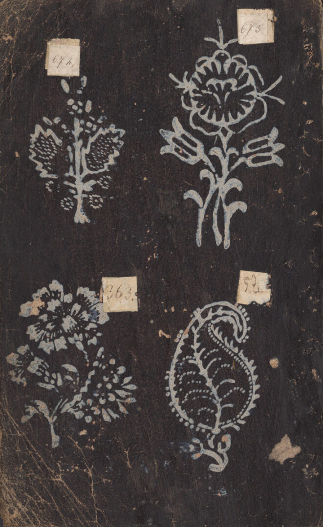 List vzorkovníka: obojstranne potlačený kartón s bielym vzorom 1. predná strana: dva veľkoplošné kvetinové motívy v silných kontúrach, usporiadané nad sebou, so štylizovanými kvetmi. Vpravo hore nalepené číslo 670, vpravo v strede nalepené číslo 671. 2. zadná strana: v ploche symetricky rozmiestnené štyti rôzne kvetinové motívy, pri každom z nich nalepené číslo: vľavo hore 672, vpravo hore 673, uprostred vľavo 363, uprostred vpravo 58.(?)