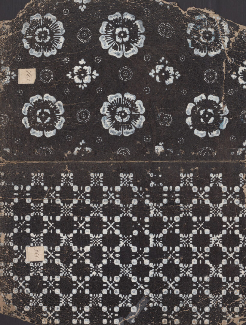 Vzorkovník modrotlače – dvojhárkový kartón s otlačeným bielym vzorom. Pravý horný roh ako aj pravý dolný roh poškodené. 1. predná strana: plocha vertikálne rozdelená na dve polia s totožnou výzdobou. v poradí zľava: pás menších kvetov zhotovených tučnou kontúrou, vedľa spletené „stuhové“ dve vlnovky – jedna v negatívnom prevedení, druhá „sieťová“ vybodkovaná. To sa opakuje v pravom poli. Hore nalepené číslo 545. 2. zadná strana: cez celú plochu geometrický ornamentálny motív kosoštvorcov v diagonálnom rasteri zložený z bodiek,a štvorčekov. Hore nalepené číslo 456. 3. strana: po celej ploche rozložená kvetinová výzdoba z šiestich veľkých identických kvetov, medzi ktorými sú malé kvety. Plochu vypĺňajú väčšie a menšie bodkované krúžky. Hore nalepené číslo 547. 4. strana: v celej ploche v horizontálnych pásoch opakujúci sa rastlinný ornamentálny motív: stredová stonka, na nej po oboch stranách znázornené listy v podobe oblúčikov, kvet v podobe bodkovaného kosoštvorca. Pozadie vybodkované drobnými bodkami. Hore nalepené číslo 548.
