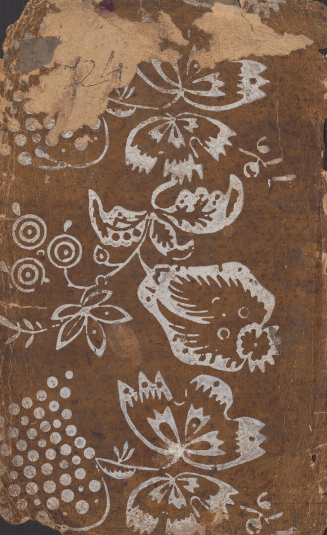 List vzorkovníka: obojstranne potlačený kartón s bielym vzorom. Okraje kartónu poškodené. 1. predná strana: celá plocha zdobená v diagonálnych pásoch identickými štylizovanými „vajárovitými“ kvetmi 2. zadná strana: Celú stranu zaberá veľkoplošný kvetinový motív z tučných kontúr. Vľavo hore časť potlačeného povrchu kartónu strhnutá. Na odtrhnutom mieste napísané číslo 724.