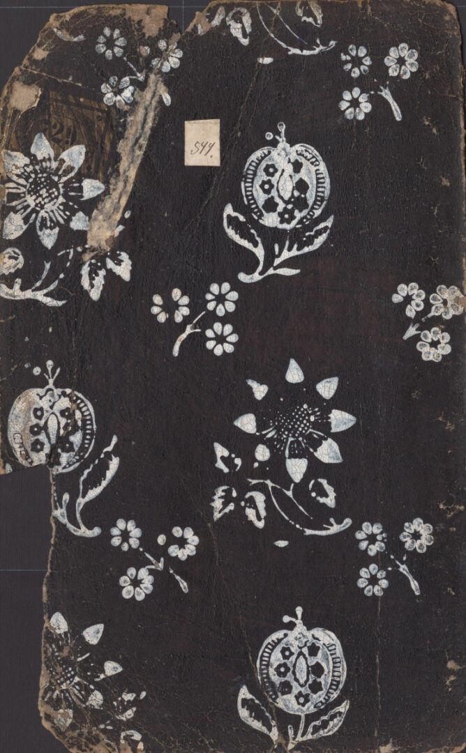 List vzorkovníka: obojstranne potlačený kartón s bielym vzorom. spodná časť pravého okraja kartónu odtrhnutá. 1. predná strana: celá plocha zdobená rozmernými identickými štylizovanými kvetmi s bodkovanými stredmi. Vo vrchole nalepené číslo 543. 2. zadná strana: celá plocha pokrytá kvetinovými ornamentálnymi motívmi z dvoch druhov veľkých štylizovaných kvetov s lístkami.Vo vrchole nalepené číslo 544.