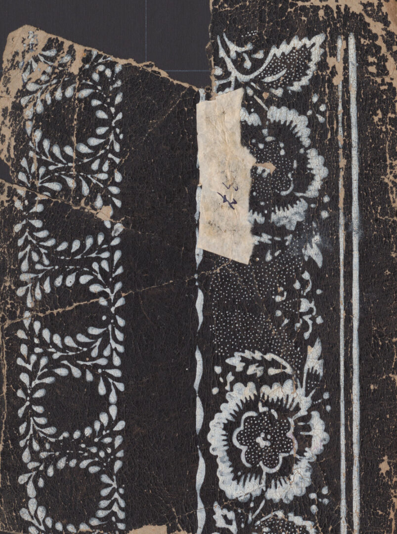 List vzorkovníka: obojstranne potlačený centrálny fragment kartónu s bielymi vzorkami bordúr. 1. predná strana: vertikálny „stuhový“ vzor s pásom veľkoplošných štylizovaných bodkovaných listov . V strede nalepené číslo 36. 2. zadná strana: pôvodná plocha vertikálne rozdelená na dve polia – v ľavom súvislý „venčekový“ pás z drobných lístkov. V pravom „stuhový“ pás s veľkoplošnými kvetmi vpravo lemovaný rovnobežkami. V strede nalepené číslo 37.