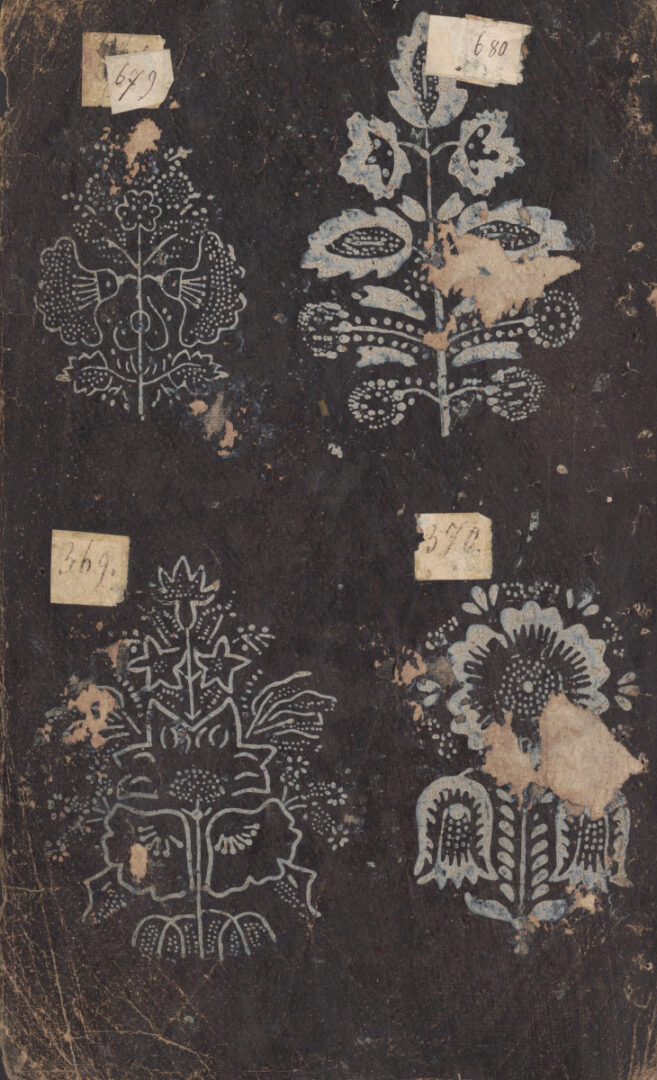 List vzorkovníka: obojstranne potlačený kartón s bielym vzorom. 1. predná strana: na celej ploche zobrazené tri vzory: v hornej časti v strede trojica veľkoplošných kvetov v silnej kontúre, vpravo nad nimi nalepené číslo 365, vľavo dole v silnej kontúre asymetrický kvetinový motív s nalepeným číslom 677, vpravo dole menší asymetrický motív vetvičiek s drobnými lístkami a s vedľa nalepeným číslom 366. 2. zadná strana: v ploche symetricky rozmiestnené štyri rôzne klvetinové motívy s nalepenými číslami vzorov: vľavo hore 679, vpravo hore 680, vľavo dole 369, vpravo dole 370.