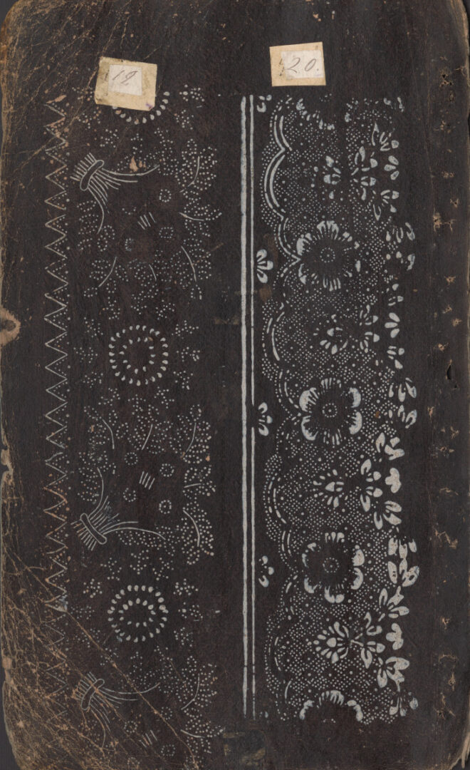 List vzorkovníka: obojstranne potlačený kartón bielymi vzormi bordúr 1. predná strana: Celá plocha delená vertikálne na dve polia – v ľavom poli pás linajkových a vybodkovaných vlnoviek delených v pravidelných úsekoch kvetmi. V hornej časti nad pásom nalepené číslo 17. V pravom poli pás ostro lomenej vlnovky so štylizovanými bodkovanými kvetmi, prelínajúcej sa so zvlneným bodkovaným pásom. V hornej časti nalepené číslo 18. 2. zadná strana: Plocha kartónu predelená vertikálne na dve polia, v ľavom poli pás štylitovaných bodkovaných kytíc lemovaných vľavo zuborezom, vo vrchole nalepené číslo 19. V pravom poli pás kvetov s vybodkovaným priestorom okolo nich, vľavo vymedzený dvomi linajkami. Vo vrchole nalepené číslo 20.