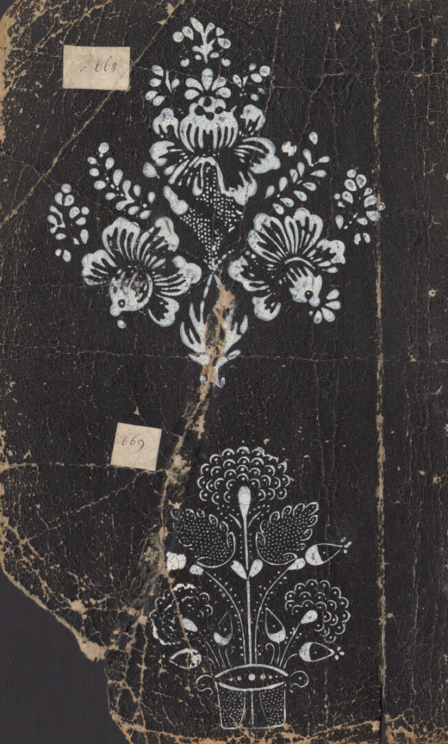 List vzorkovníka: obojstranne potlačený kartón s bielym vzorom. Pravý spodný roh kartónu odtrhnutý. 1. predná strana: na celej ploche sú otlačené tri samostatné vzory: v hornej časti štylizovaný kvetinový motív s kontúrovými lístkami vo vrchole a bodkovanými kvetmi v spodnej časti, hore nalepené číslo 665., uprostred vpravo kvetinový motív s ôsmimi kvetmi na stonke, vychádzajúci zo špirály, nad ním nalepené číslo 666, vľavo dole symetrický „filigránový“ kvetinový motív s vejárovitým kvetom uprostred, nad ním nalepené číslo 667. 2. zadná strana: na ploche dva veľkorozmerné kvetinové motívy – v hornej časti „trojkvet“ v silných kontúrach, nad ním vľavo hore nalepené číslo 668, v spodnej časti symetrický „filigránsky“kvetinový motív v kvetináči, vľavo nad ním nalepené číslo 669.