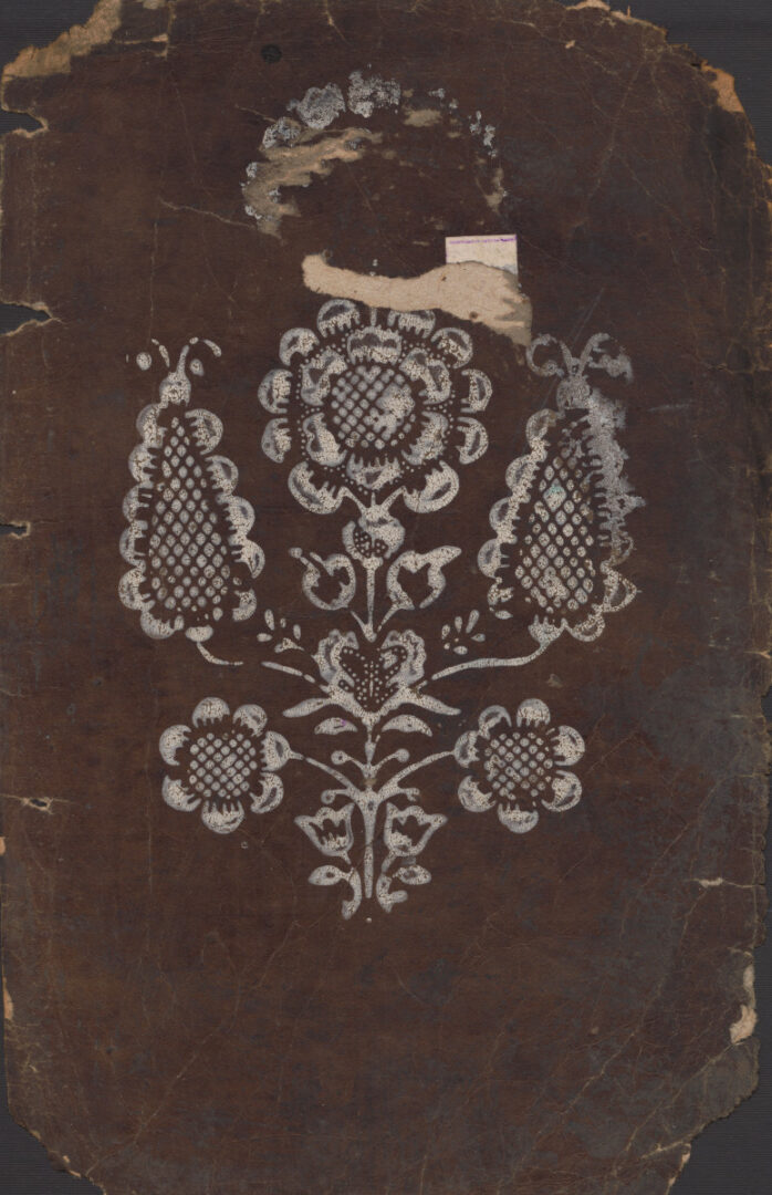 Vzorkovník modrotlače, hárok kartónu s obojstranne otlačeným bielym vzorom: 1. strana: Na celej ploche sú nad sebou umiestnené dva odlišné veľké jednoduché kvetinové motívy zložené z bodiek a čiarok. Nad horným je nalepené číslo 663, nad spodným číslo 664. 2. strana: Na ploche jeden mohutný centrálny kvetinový motív zhotovený tučnými kontúrami. Povodné nalepené číslo nad ním je spoloviny strhnuté (665 ?). Okraje kartónu poškodené.