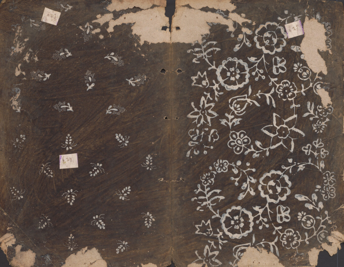 Vzorkovník modrotlače – dvojhárkový kartón s otlačeným bielym vzorom. 1. strana: Plocha kartónu horizontálne rozdelená na dve polia: horné pole – vo vrchole nalepené číslo 621, výzdoba v podobe voľne rozložených bodkovaných ratolestí. Dolné pole – symetricky rozložené drobné štylizované kvety s motívom granátového jablka (?). V strede nalepené číslo 622. 2. strana: Plocha kartónu horizontálne rozdelená na dve polia, v hornej a spodnej časti nalepené čísla 623 a 624. Horné pole zdobené voľne rozloženými drobnými rastlinkami s vybodkovanými kvetmi. Dolné pole zdobené kvetmi v podobe drobných strapcov. V pravom hornom rohu a v ľavom dolnom rohu strhnutá časť povrchu kartónu. 3. strana: Celoplošná výzdoba z veľkorozmerných kvetov so stonkami a lístkami. V hornej časti nalepené číslo 625. Plocha čiastočne poškodená strhnutým povrchom kartónu na viacerých miestach. 4.strana: výzdoba v strede plochy (jednou šablónou) zložená z väčších „trojlistov“ s množstvom drobných vetvičiek a lístkov okolo. V hornej časti nalepené číslo 626 a zvyšok pôvodnej bielej nálepky s iniciálami „BZ…“, v spodnej časti zvyšok červenej nálepky.