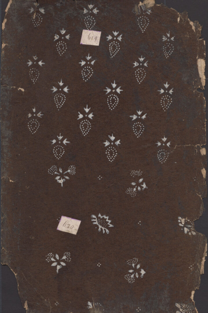 Vzorkovník modrotlače – hárok kartónu s potlačeným bielym vzorom (+ 1 fragment). Kartón značne poškodený. 1. strana: v pravom hornom rohu strhnutá časť potlačeného povrchu. V strede hore nalepené číslo 618. Plocha zdobená kvetinovými motívmi so striedajúcimi sa väčšími a menšími kvetmi. 2. strana: Vo vrchole nalepené číslo 619. Celá plocha je horizontálne delená na dve polia – horné so symetrickou diagonálnou výzdobou kvietkov v podobe bodkovaných kvapiek s tromi štylizovanými trojlístkami vo vrchole. – dolné štvorica kvetín so štylizovanými vybodkovanými dvojkvetmi na stonke s trojicou lístkov. v strede medzi nimi jeden štylizovaný kvet v tvare otvorenej mušle s bodkovaným stredom. v spodnej časti nalepené číslo 620.