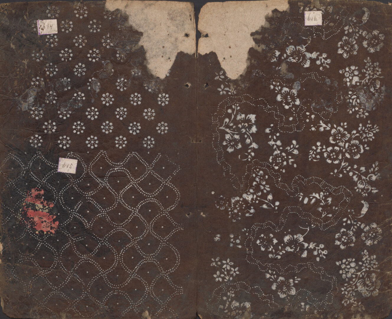 Vzorkovník modrotlače – dvojhárkový kartón s otlačeným bielym vzorom. 1. strana: v hornej časti nalepené číslo 612. výzdobná locha rozdelená horizontálne na dve polia – horné má „sieťovú“ výzdobu z diagonálne rozmiestnených štvorcov, ktoré tvoria kompozícia vybodkovaných koliesok. V strede každého z týchto štvorcov je umiestnená kvetina. – dolné – pravidelná kompozícia bodkovaných koliesok, štvorbodiek a jednotlivých bodiek. Uprosttred nalepené číslo 613. 2. strana: plocha horizontálne delená na dve polia, v hornej časti nalepené číslo 614. výzdobu predstavujú diagonálne pásy jednoduchých bodkovaných kvetov. V dolnej časti je výzdoba v podobe zvlnenej bodkovanej siete s bodkou v každom jej oku. Uprostred nalepené číslo 615, a zvyšky po pôvodnej červenobielej nálepke. Pravý horný roh so strhnutým potlačeným povrchom. 3. strana: Celoplošný kvetinový motív zložený z rôznych kytíc a kytičiek spojených sieťovou bodkovanou stuhou. V hornej časti kartónu nalepené číslo 616. Ľavý horný roh so strhnutým potlačeným povrchom. 4. strana: Celoplošný dekor zložený z dvoch vertikálnych pásov: ľavý predstavuje drobné kytičky zviazané bodkovanou stuhou „na mašlu“, pravý predstavuje mohutné kvety pivónie spojené navzájom širšou zvlnenou bodkovoanou stuhou. Vľavo hore nalepené číslo 617.